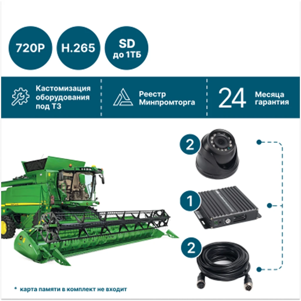 Комплект видеонаблюдения NSCAR AE201_SD – оптимальное решение для базового оснащения сельхозтехники (тракторов, комбайнов, опрыскивателей) системой видеоконтроля.